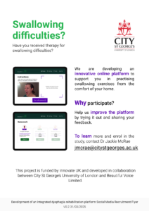 We are seeking people in the UK with eating, drinking and swallowing difficulties to participate of 2-week study organised by City St. George’s University. If you would like to know more details, please e-mail Dr Jackie McRae on jmcrae@citystgeorges.ac.uk.